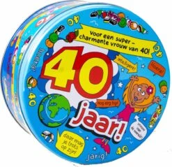 Snoeptrommel voor vrouw met boodschap: Hoera 40 jaar! Leuke snoeptrommel met vrolijke illustratie.