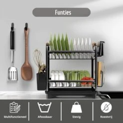 Afwassen is meestal geen hobby voor veel mensen, maar met dit Zwarte Afdruiprek met Flexibele Waterafvoer kun je het een stuk aangenamer en effectiever maken! Geen natte of vuile aanrecht meer en ook geen serviesgoed dat gelijk afgeveegd moet worden. Dit afdruiprek zorgt niet alleen voor een schonere en opgeruimde keuken, het ziet er ook nog eens luxe en stijlvol uit. De anti-lekbak met afvoer zorgt ervoor dat het overtollige water direct in de gootsteen kan weglopen. De afvoer is flexibel inzetbaar, dus het werkt altijd in elke keuken.