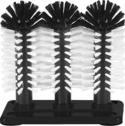 3-delige spoelborstel 18 cm hoog op stevige kunstof voet, met zuignappen aan de onderzijde zodat de spoelborstels goed vast blijven zitten in de spoelbak.