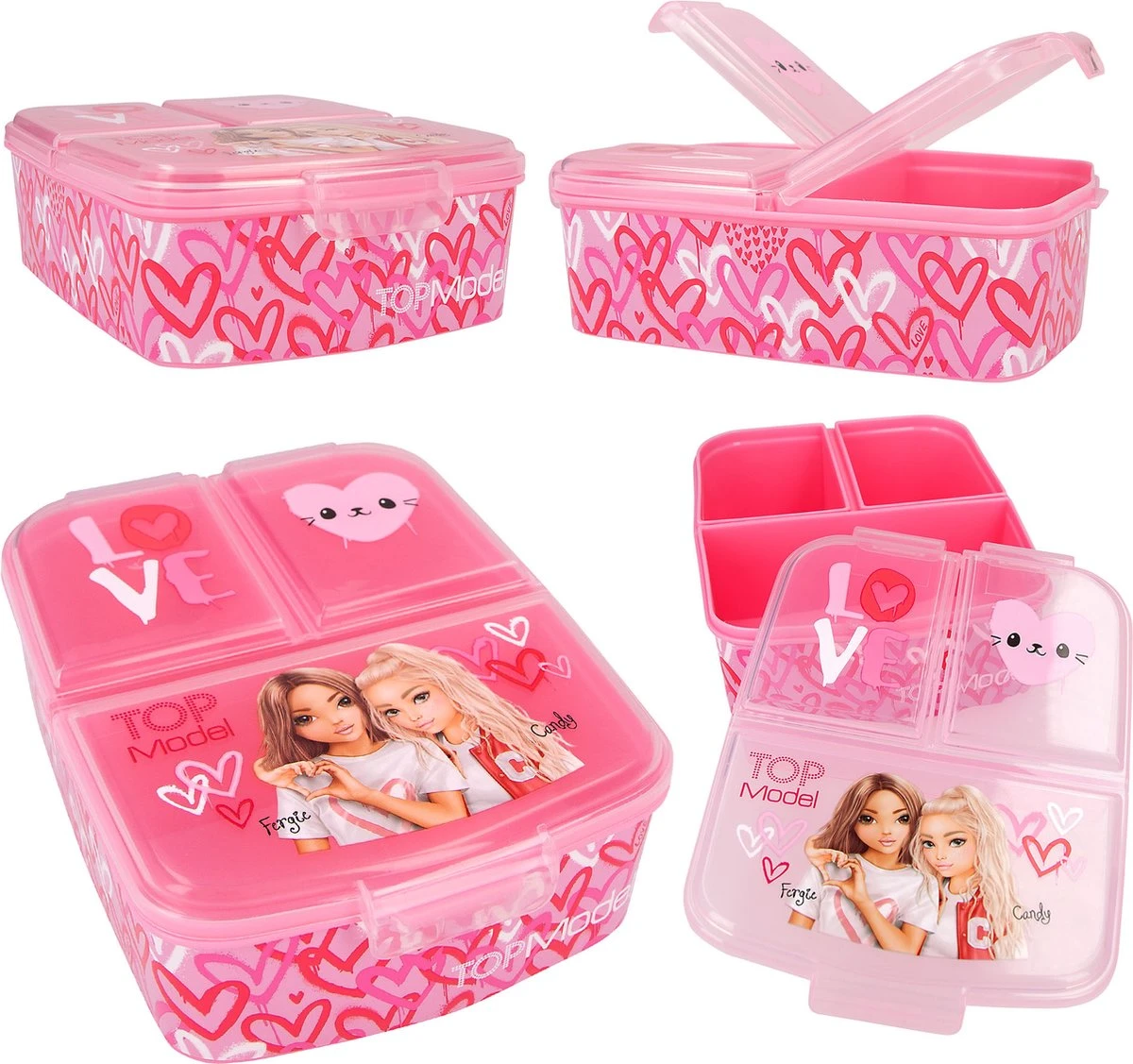 De naam van de TOPModel serie One Love is zeker terug te zien op deze broodtrommel: mooie rood- en rozetinten, een prachtig model, schattige hartjes en trendy teksten. De broodtrommel heeft 3 aparte vakken binnenin (1 groot vak, 2 kleine) met handige kliksluiting.