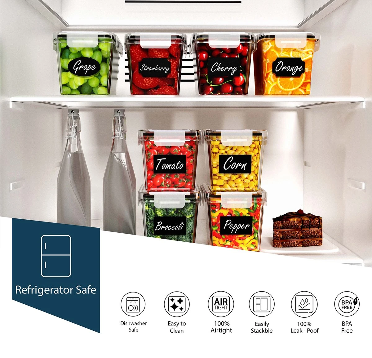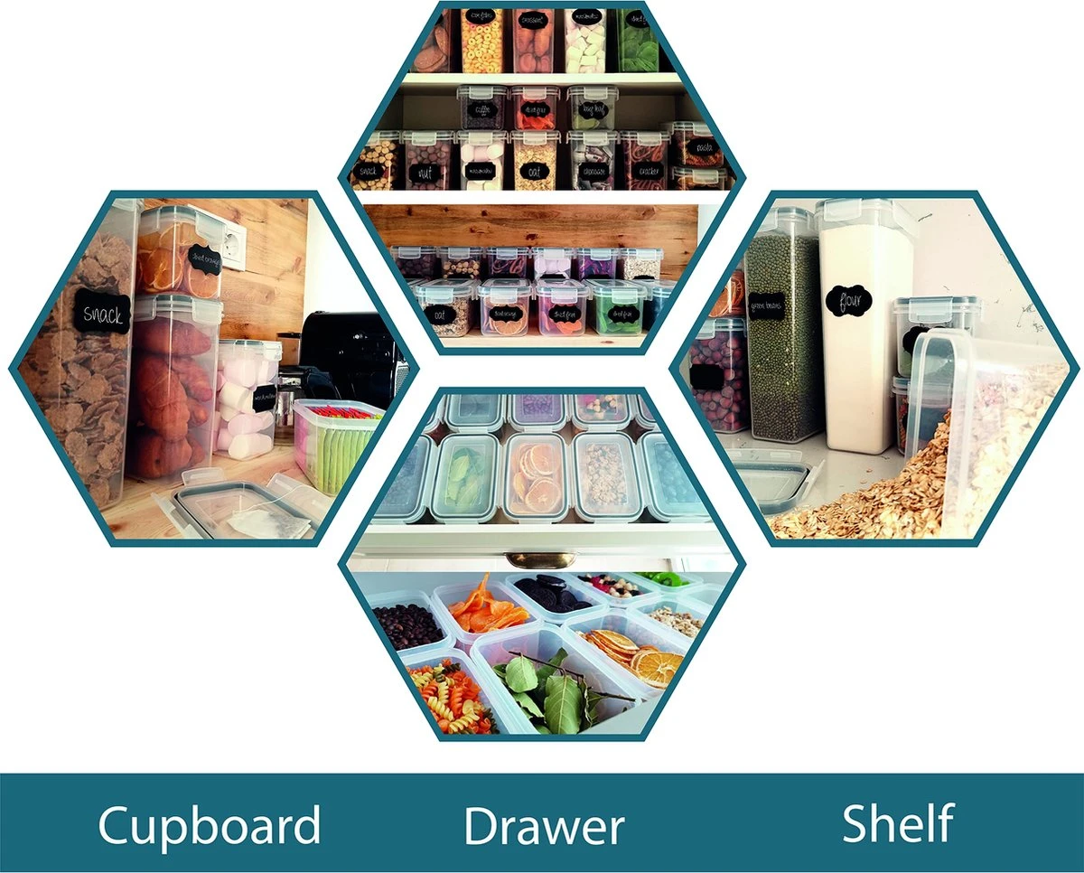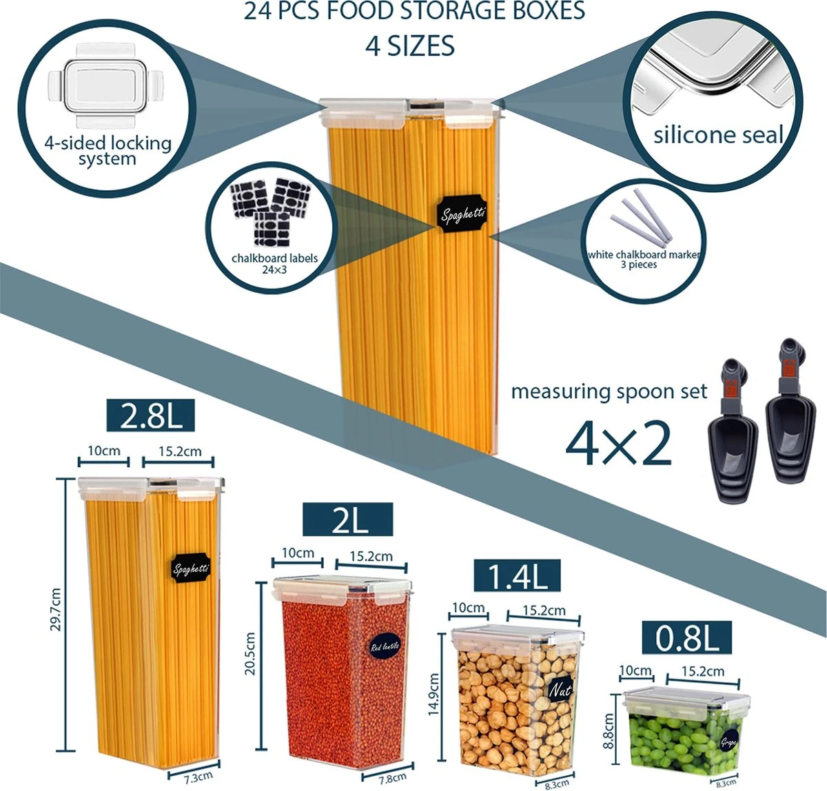 Deze 24 luchtdichte en veilige opbergdozen zijn ideaal voor het bewaren van droge levensmiddelen zoals muesli, pasta, meel, suiker, rijst, noten, bonen, koffie en thee, maar ze zijn net zo geschikt voor vloeistoffen zoals water, sap, soep. De deksels met siliconen afdichting zorgen voor een volledige luchtdichtheid, waardoor je favoriete snacks fris en droog blijven.