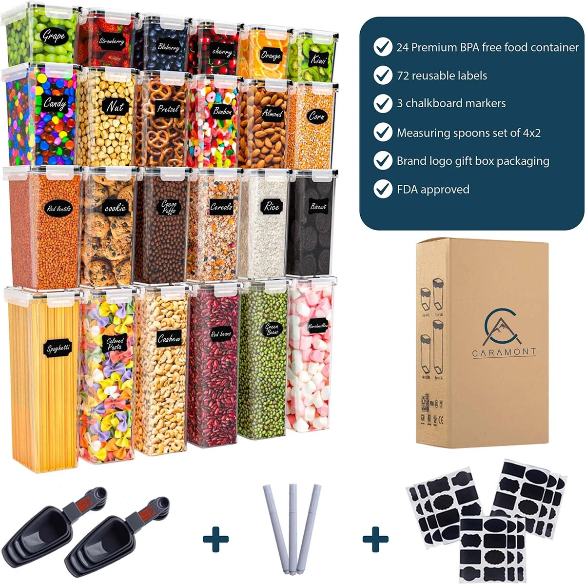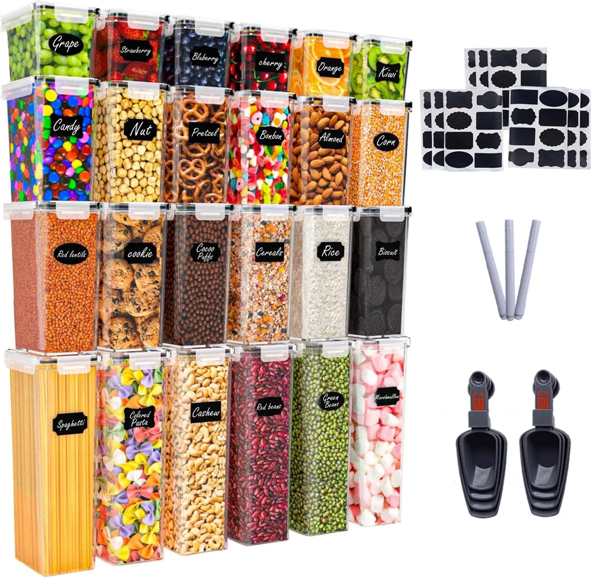 - Multifunctioneel gebruik: deze 24 luchtdichte en veilige opbergdozen zijn ideaal voor het bewaren van droge levensmiddelen zoals muesli, pasta, meel, suiker, rijst, noten, bonen, koffie en thee, maar ze zijn net zo goed geschikt voor vloeistoffen zoals water, sap, soep. De deksels met siliconen afdichting zorgen voor een volledige luchtdichtheid, waardoor je favoriete snacks fris en droog blijven.