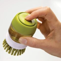 Deze innovatieve Palm Scrub afwasborstel van Joseph Joseph is ideaal voor het reinigen van pannen en servies. De afwasborstel is niet zo maar een afwasborstel, want deze is bevestigd op een handige zeepdispenser die u kunt vullen met afwasmiddel. Met 1 druk op de knop komt het afwasmiddel uit de dispenser via de afwasborstel, waardoor u servies en pannen eenvoudig kunt reinigen. Het afwassen van uw servies in een sopje is dus verleden tijd! Dit werkt niet alleen prettig, maar is ook hygiënisch. U hoeft servies en pannen nu nooit meer te reinigen in water dat al vervuild is. De afwasborstel heeft anti-kras borstelharen, waardoor u deze ook prima kunt gebruiken in pannen met een anti-aanbaklaag. De afwasborstel wordt bovendien geleverd met een handige houder. De houder vangt overtollig water en zeep, afkomstig uit de afwasborstel, eenvoudig op in het reservoir. U kunt de houder eenvoudig uit elkaar halen om het overtollige water en zeep weg te gooien. Daarna kunt u de houder eenvoudig reinigen in de vaatwasmachine. Hierdoor kunt u hygiënisch werken.