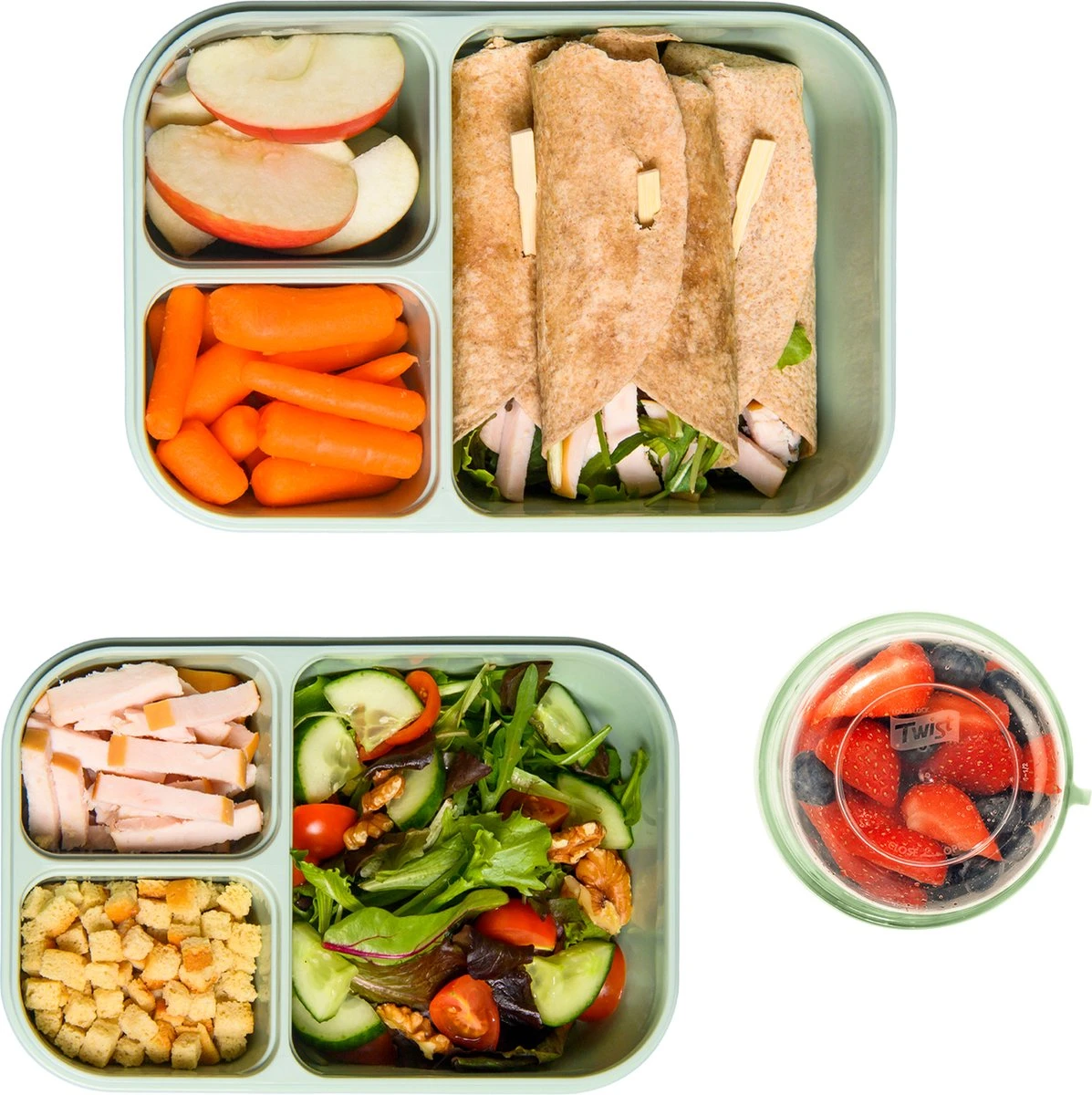 Dankzij de bakjes in de lunchboxen is het mogelijk om verschillende producten gescheiden van elkaar mee te nemen en te bewaren.