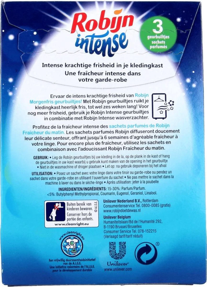 Robijn Intense Geurbuiltjes zorgen voor een langdurige frisheid van je kleding na het wassen. Elk geurbuiltje bevat speciale parfumparels die tot wel 6 weken lang een heerlijke geur verspreiden. Gebruik de builtjes bijvoorbeeld in je kledingkast door ze aan een kledinghanger te bevestigen of door ze tussen je kleding te plaatsen. Zo worden je zintuigen op een aangename manier geprikkeld zodra je je kledingkast opent. Dat is een heerlijk begin van je dag. Robijn Intense Geurbuiltjes zijn ook uitermate geschikt om mee te nemen in je reiskoffer; zo ben je ook tijdens je vakantie verzekerd van fris ruikende was, net zoals thuis. Wanneer je Robijn Intense Geurbuiltjes gebruikt in combinatie met Robijn wasmiddel en Robijn wasverzachter, ben je verzekerd van de beste bescherming. Je was blijft dan langer mooi en ruikt langer fris. Dankzij de speciale formules van Robijn wasproducten worden de vezels en kleuren van je kleding namelijk beschermd, zodat je nog langer van je favoriete kleding kunt genieten. Dankzij het lekkere parfum in de producten van Robijn ruikt je kleding bovendien altijd heerlijk schoon. Robijn is er voor alle was. Ook voor de al gewassen kleding. Geef je kleding daarom net dat beetje extra met Robijn Intense Geurbuiltjes.