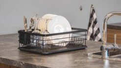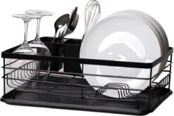 Laat je afwas afdruipen in dit trendy afdruiprek. Aan de onderkant zit een los plateau dat het water opvangt, deze is gemakkelijk leeg te maken. Dit afdruiprek wordt geleverd inclusief een bestekbakje verdeeld in twee vakken. Het is mogelijk om het bestekbakje te bevestigen aan de zijkant van het rek waardoor je je bestek gemakkelijk sorteerd.
